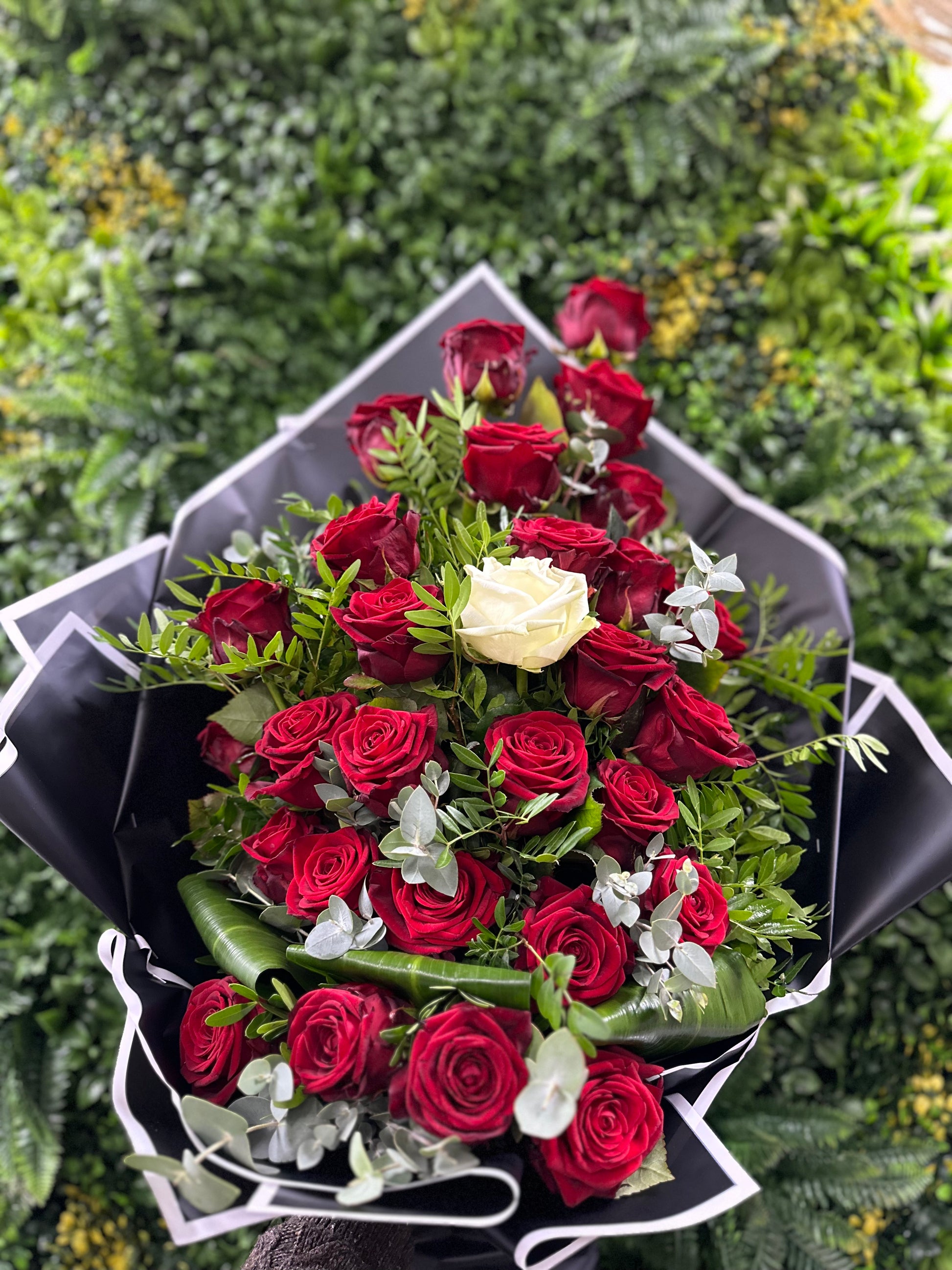 29x rote Rosen - 1x weiße Rose - Eukalyptus - Pistazien - Blattgrün - moderne Verpackung