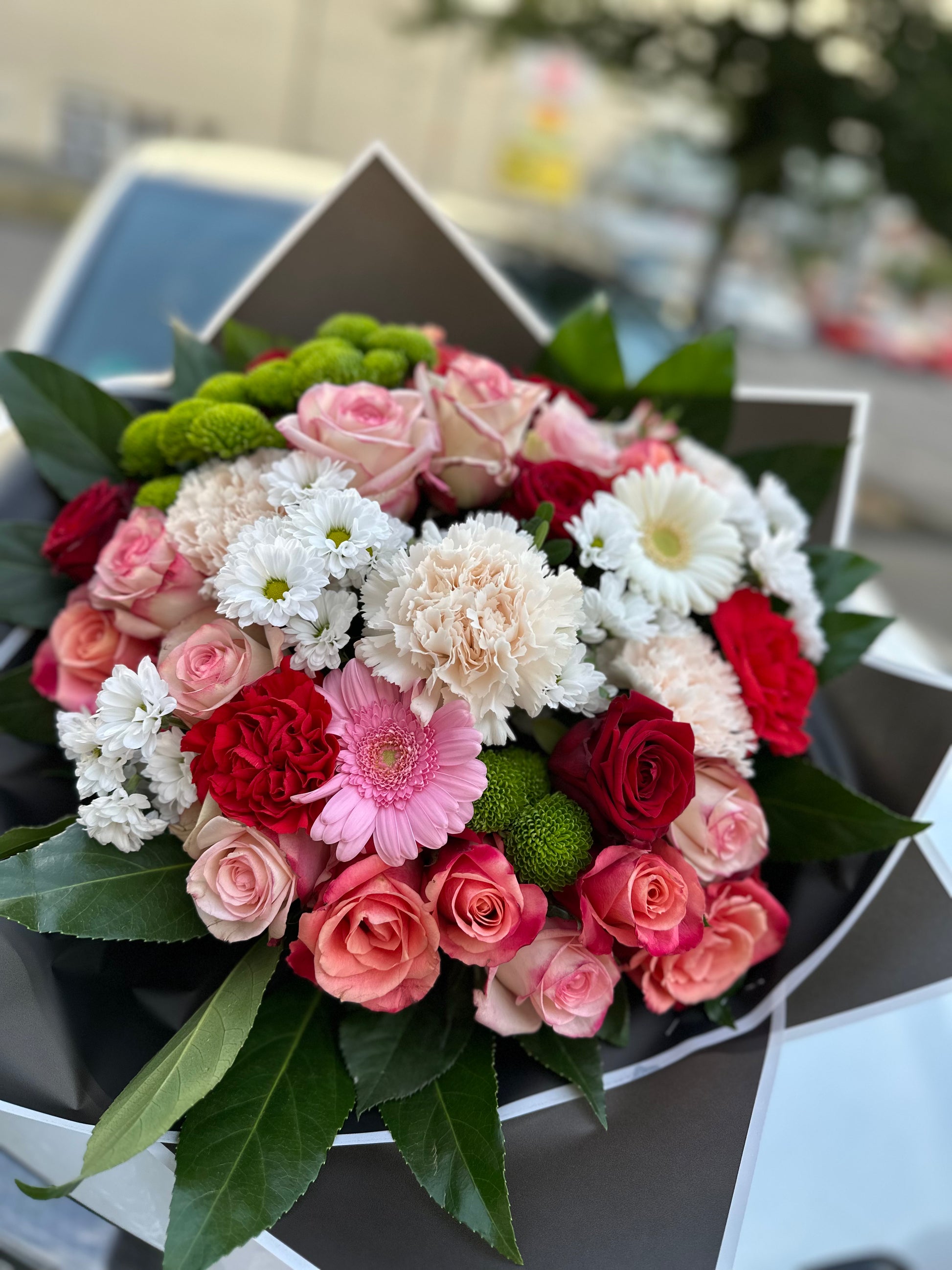 20x Rosen - 5x rote Rosen - 3x rote Nelke - 3x beige Nelke - 6x Chrysanthemum - 4x Gerbera - Pistazien - Aralienblätter - moderne Geschenkverpackung