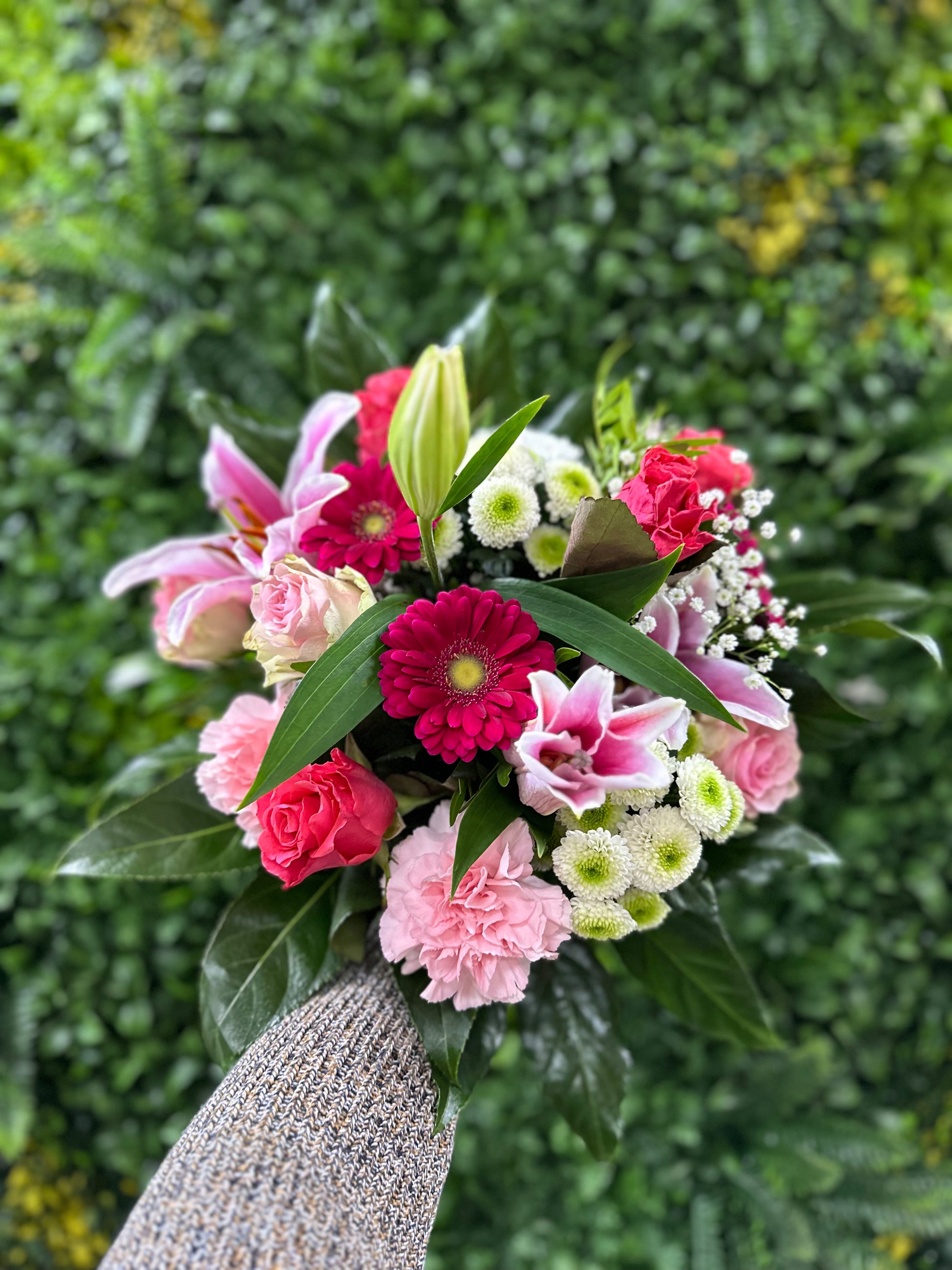 8x Rosen - 1x Lilie - 3x Gerbera - 2x Nelken - 2x Chrysanthemum - Schleierkraut - Pistazien - Aralienblätter