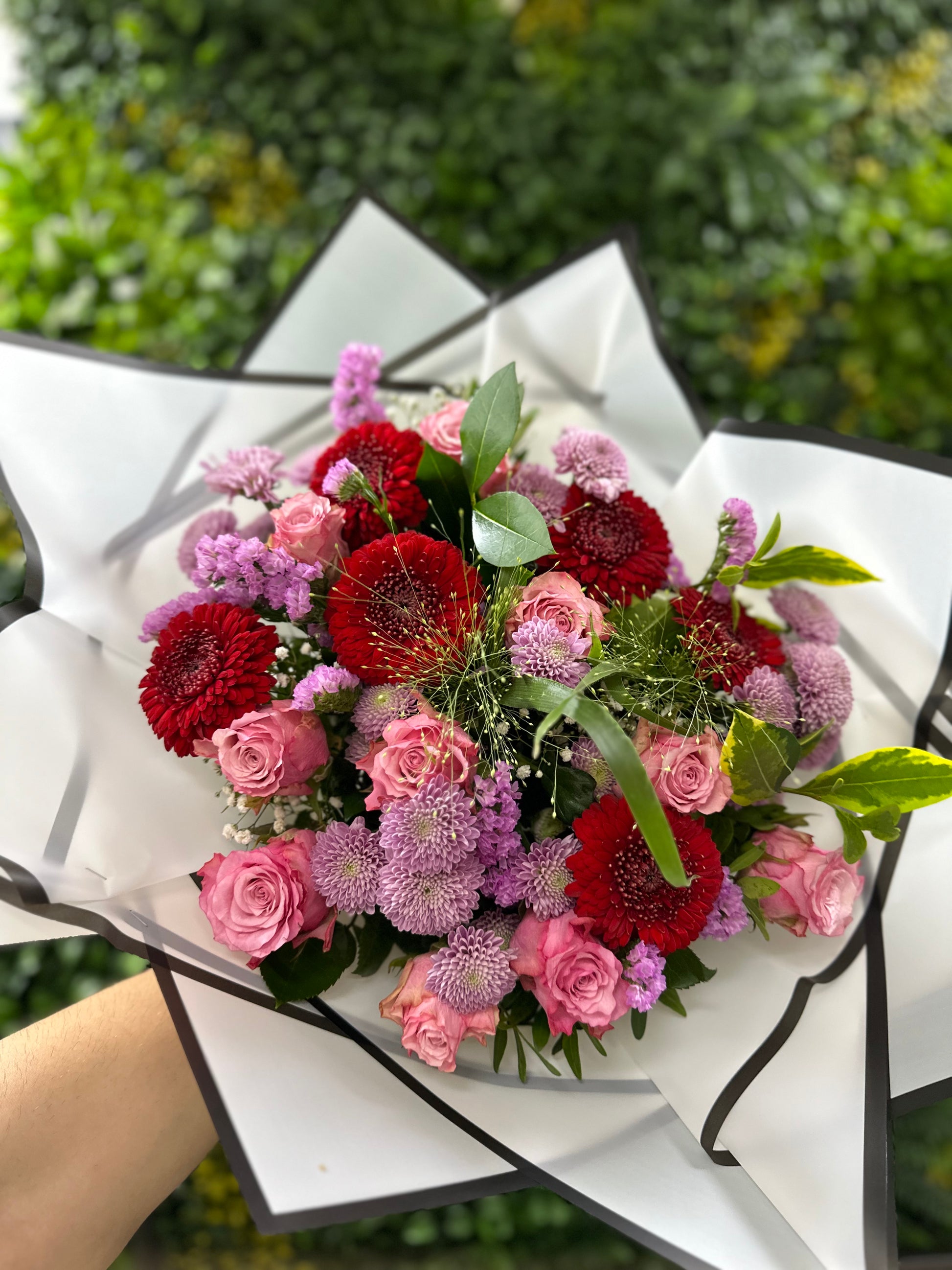 6x Dahlien - 10x Rose - 1xZappelgras - 5x Chrysanthemum - Schleierkraut - Pistazien - moderne Geschenkverpackung