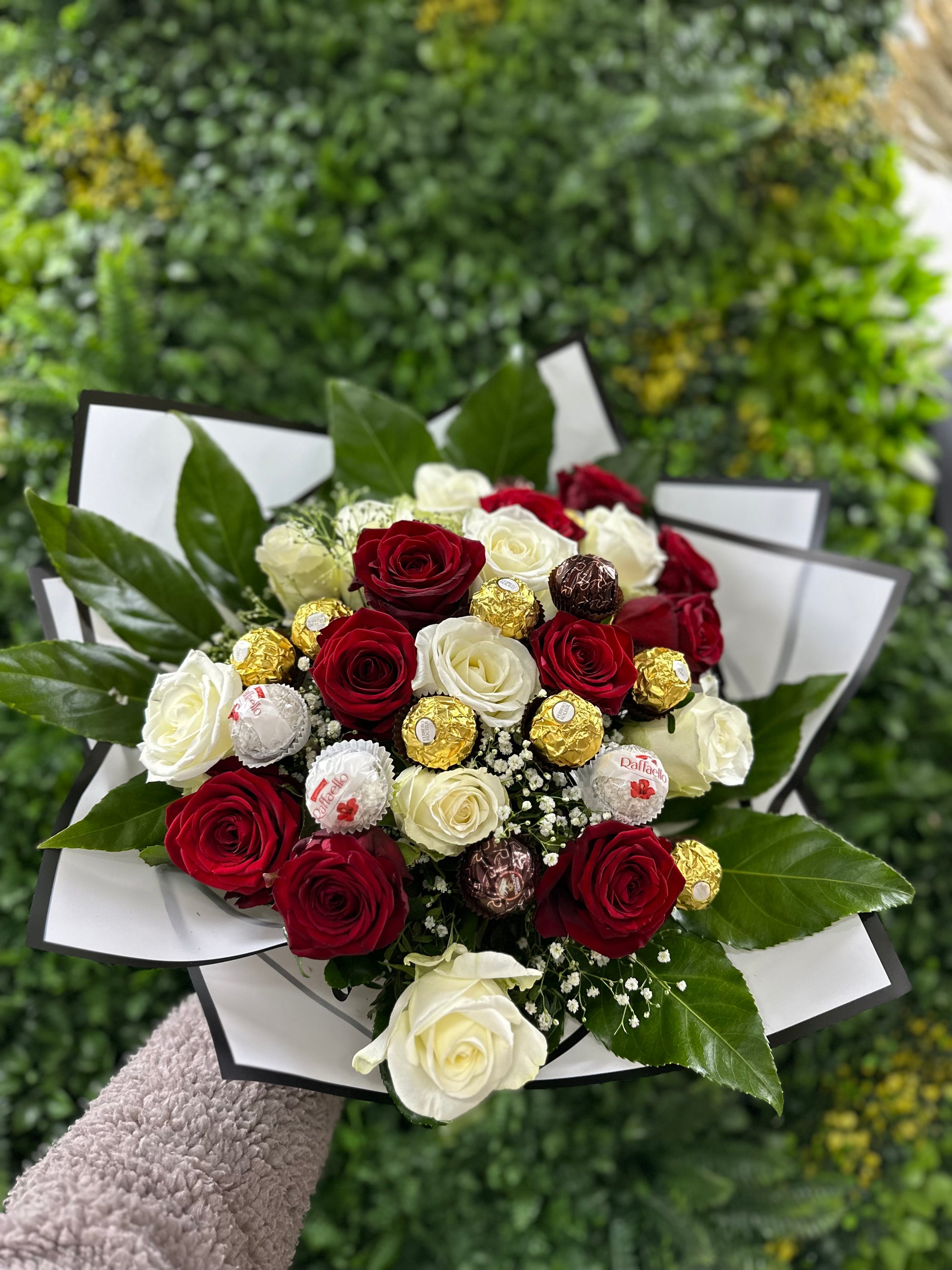 10x rote Rosen - 10x weiße Rosen - Schleierkraut - Pistazien - Aralienblätter - moderne Geschenkverpackung - 10x Stiele Schokolade