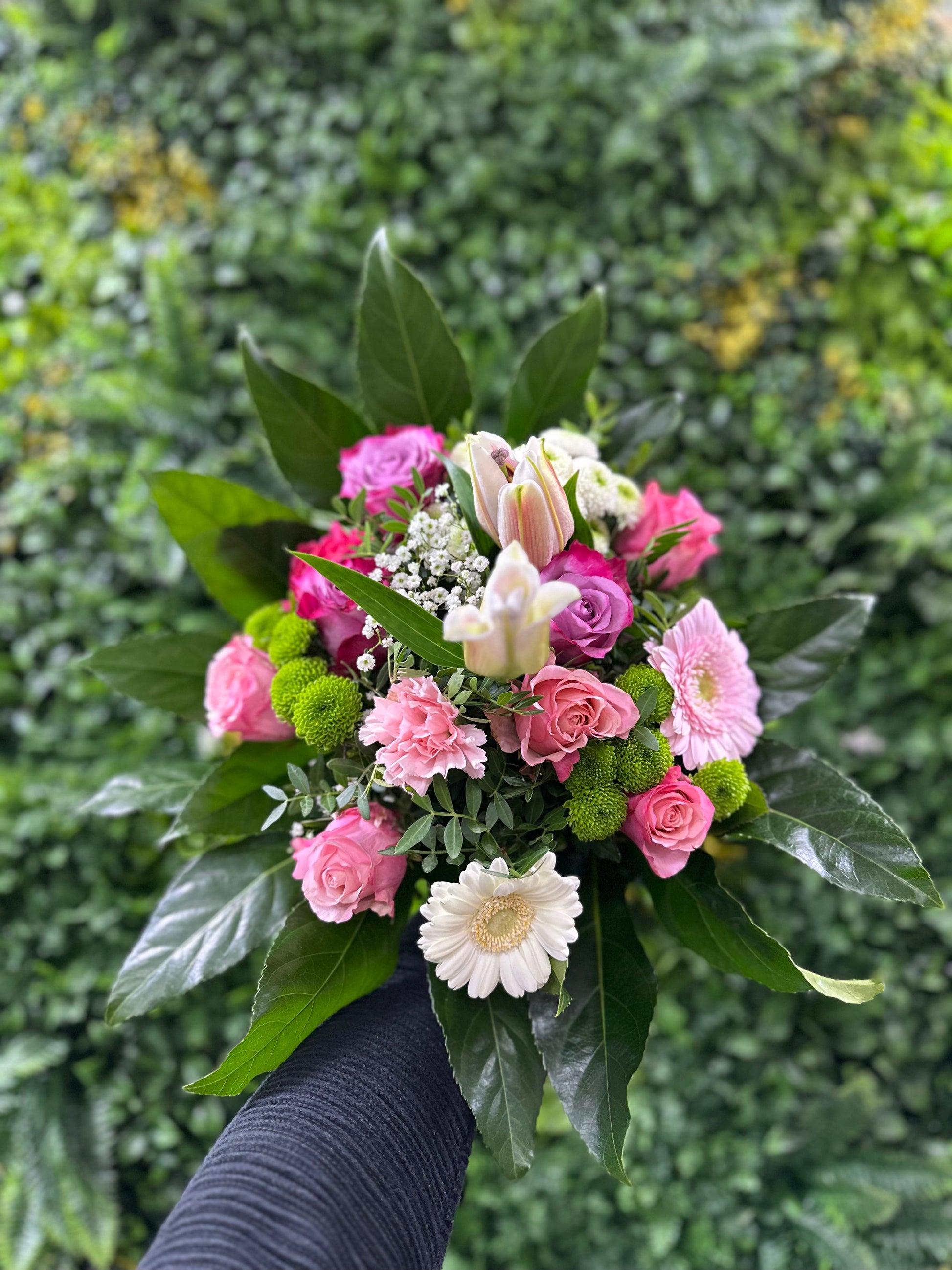 10x Rosen - 1x Lilie - 1x Nelke - 3x Chrysanthemum - 2x Gerbera - Schleierkraut - Pistazien - Aralienblätter