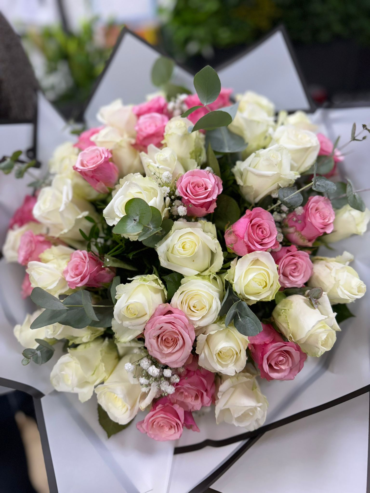 30x weiße Rose - 30x pinke Rose - Eukalyptus - Schleierkraut - Pistazien - moderne Geschenkverpackung
