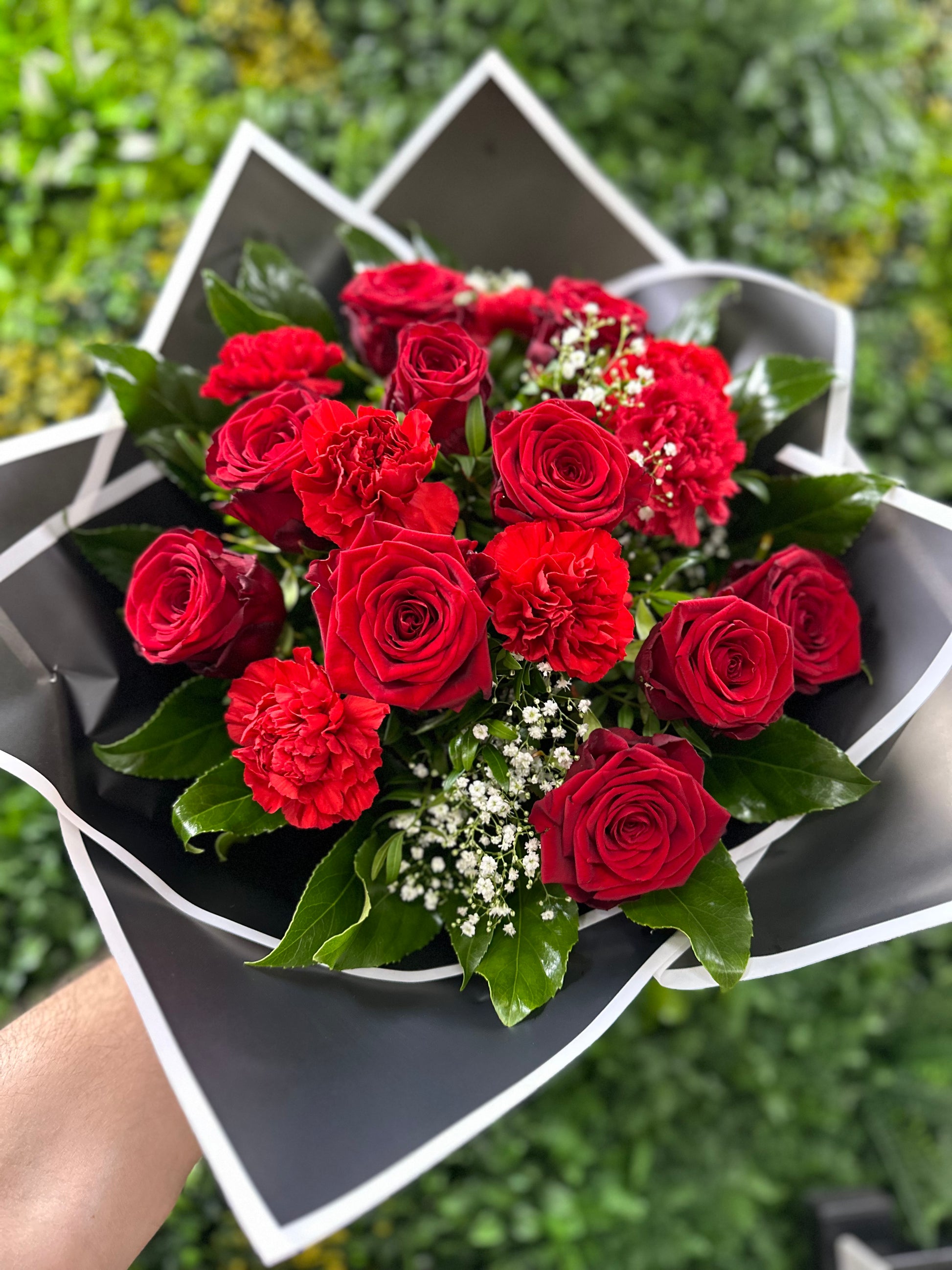 10x rote Rosen - 7x Nelke - Schleierkraut - Pistazien - moderne Geschenkverpackung
